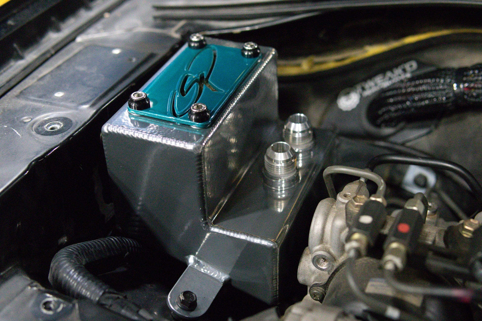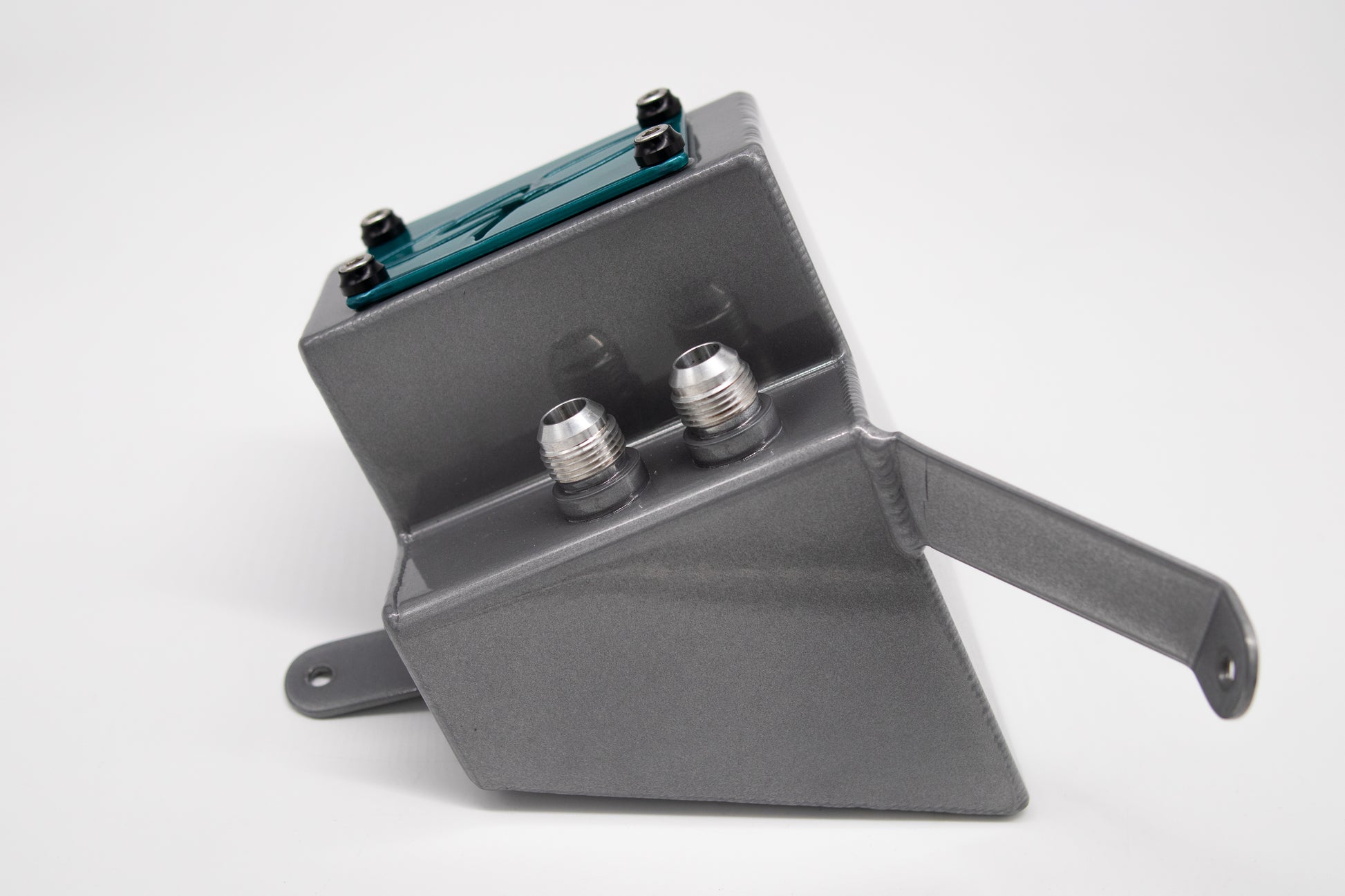 This all new MKIV Catch Can system is the optimal choice for MKIV Supra especially when pushing it to the limits. The factory PCV system is vastly underpowered and cannot keep up with the higher pressures that a big power Supra produces. These pressures can have detrimental effects on your engine and turbo if they are not properly kept in check. This catch can takes the place of the OEM charcoal canister and uses all factory mounting points so there is no drilling required!  This is made to work with the factory turbo set up. The use of larger turbo kits, requires to move the catch in place of the ABS pump.